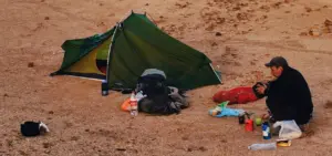 In Gebieten mit wenig Wasser nehme ich noch Wassersäcke mit, entsprechend der Situation. Für Wüstentouren nehme ich 2 X 4l Wassersäcke plus Einwegflaschen für die Wasserversorgung mit.
