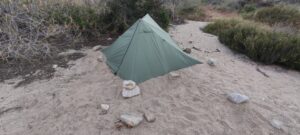 Bei der ersten Nutzung stellten wir dann direkt fest, dass das Durston X-MID 2 riesig ist. Die Grundfläche ist enorm. Bisher haben wir immer einen Platz gefunden. Aber ein Platz war so klein, dass wir es einfach nicht richtig aufgestellt bekommen haben. Ein anderer Platz war nicht zu finden, da ein Sturm heranzog und alle besseren Plätze belegt waren. So flatterte das Zelt die ganze Nacht. Aber es hielt. Auch die nächsten zwei Tage hielt der Wind an und auch an den besseren Zeltplätzen hatten wir Schwierigkeiten das Zelt richtig aufzustellen. Genau das ist der große Nachteil. Es ist laut Dan Durston nach mathematischen Regeln erstellt, um das Optimum aus Größe und Gewicht zu erzielen. Dabei leidet aber die Praktikabilität.