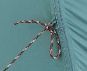 Die Abspannpunkte an den Zeltwänden sind nicht verstärkt und ich gehe davon aus, dass sie reißen, wenn stärker Wind aufkommt. Die Zeltwände sind einfach zu riesig für die kleinen Befestigungspunkte.