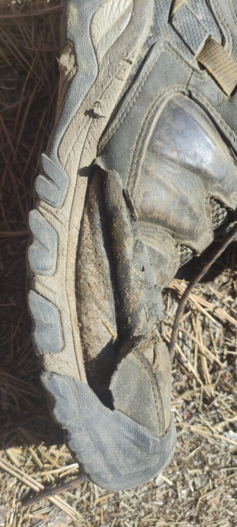 Ich verwende die Keen Targhee 3 mid wide Wanderschuhe nun seit 6 Wochen ununterbrochen auf dem Pacific Crest Trail und bin damit 1000 km gelaufen. In einer Woche erreichen wir Kennedy Meadows und ich werde dort hoffentlich neue Schuhe erwerben können. Meine Befürchtung ist, dass die Schuhe die Sierra nicht überstehen werden. Warum?