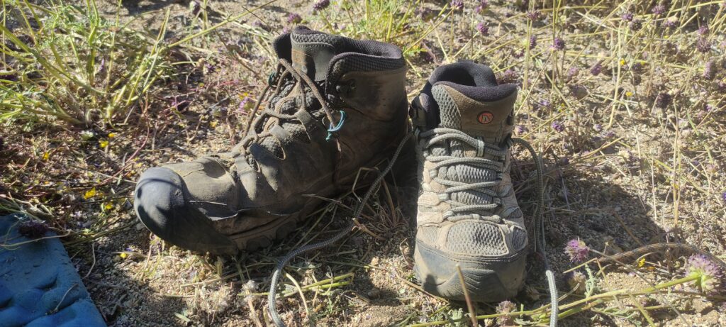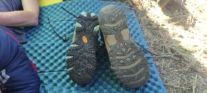 Entweder ein Trailrunner oder ein „richtiger“ Wanderschuh ist für mich geeignet. Der Keen Targhee 3 Mid wide Wanderschuhe ist aus meiner Erfahrung geeignet für einfache Wanderwege in moderatem Gelände für Menschen mit breiten Füßen. Lange Haltbarkeit ist nicht zu erwarten.Siljas Merrel sieht nach der gleichen Laufleistung noch top aus, wohingegen der Keen den Anschein macht gleich auseinanderzufallen. In Kennedy Meadows muss ich mir einen „normalen“ Trailrunner holen. Aber mit Vibramsohlen!