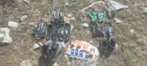Wenn wir abends an unserem Schlafplatz ankommen, versuchen wir, die letzten Sonnenstrahlen auszunutzen, um unsere Schuhe und Socken zu trocknen. Je trockener diese, um so angenehmer ist es in der Früh. Es macht ein Unterschied in nasse oder feuchte Schuhe bzw. Socken zu steigen, auch wenn diese gefrieren, macht es einen Unterschied, wie feucht sie noch waren. Trocken bekommen wir sie nie ganz.