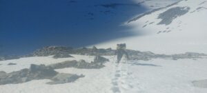 Gegen Abend wache ich auf, der Graupelschauer hat aufgehört. Wir befreien unser Zelt vom Schnee, kochen schnell was zu Abend und legen uns gleich wieder hin zum Schlafen. Am nächsten Morgen geht es mir besser, die Kopfschmerzen sind weg. Es kostet etwas Überwindung in die nassen, kalten Socken reinzuschlupfen. Die Schuhe sind gefroren, es ist gar nicht so leicht, da rein zu kommen, die Schnürsenkel sind total steif und lassen sich nicht richtig feste zubinden. Es ist noch sehr früh, unser Wecker wird jetzt immer schon um 4 Uhr morgens klingeln. Bis 9 Uhr ist der Schnee noch harsch und gut zu begehen, dann wird er weich und es ist noch okay, ab spätestens 11 Uhr ist es nur noch ein Rutschen und Schlingern und sehr mühselig. Wir wollen sicher in der Früh über die hohen Pässe kommen. Zudem werden wir durch einige Bäche müssen, die durch die Schneeschmelze eine große Herausforderung sein können. Je früher am Tag, desto weniger Wasser kommt das Tal herrunter, da es nachts noch gefriert und die Schneeschmelze unterbrochen wird. Der Unterschied von früh morgens zum späten Nachmittag können dann schon mal 10 bis 15 cm ausmachen. Es hat gerade Vollmond, so können wir ohne Stirnlampe laufen. Die Landschaft ist in Schnee und Eis gehüllt. Eine mystische Stille liegt über dem Land, die Vögel haben noch nicht mit Zwitschern begonnen und es ist nur das Knirschen des Schnees unter unseren Füßen zu hören.
