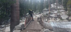 Nach dem Piute Pass wandern wir wieder runter in das Kings Canyon Tal und stoßen wieder auf den PCT. Wir wandern durch schneefreiere Stücke, dafür werden die Bachdurchquerungen mehr. Zeit, um die Socken auszuwringen oder das Wasser aus den Schuhen zu drücken haben wir nicht, dafür müssen wir zu oft durch Bäche. Wenn es zu sehr in meinen Schuhen schwabt, lasse ich kurz das Wasser aus meinen Schuhen laufen.
