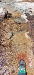 Auch haben wir nicht immer Zeit, Pitas Booties an und aus zuziehen. Nur bei den größeren und schwierigeren, machen wir dies. Leider verlieren wir so zwei Booties von ihr. Ihre Hinterpfoten sind nicht so stark belastet, die müssen jetzt ohne Booties auskommen. Ich versuche, noch besser, ihre zwei letzten Booties im Blick zu haben. Und dann kommen wir an einen Bach, wo uns dass Wasser bis zur Hüfte geht und es eine ordentliche Strömung hat. Dirk kommt mit Pita gut ans andere Ufer. Ich wage mich zwei Meter hinein und kehre um. Ich habe das Gefühl, nicht die Kraft für die Strömung zu haben. Dirk kommt nochmal zurück und bringt meinen Rucksack ans andere Ufer. Ich versuche es nochmal ohne Gepäck und schaffe es einen Meter weiter, bevor ich erneut umdrehe. Dirk kommt nochmal durch das eiskalte Wasser und wir gehen gemeinsam, Schritt für Schritt, feste aneinander geklammert rüber. Das war bisher definitiv das Herausfordernste auf diesem Trail. Wir sind total durchgefroren, vorallem Dirk mit seinen vielen Extratouren durch den Bach. Wir ziehen uns schnell aus und lassen uns in der Sonne auf einem warmen Felsen wärmen. Als wir weiter laufen, sehen wir, dass 500 Meter weiter unten der Bach deutlich leichter zu durchqueren gewesen wäre. Na ja egal, Hauptsache wir sind sicher auf der anderen Seite.