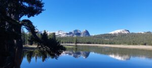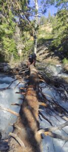 Yosemite ist deutlich schneefreier wie Kings Canyon, dafür haben wir auch deutlich mehr Flussdurchquerungen vor uns. Ich schaue mir am Abend vorher immer die geplante Strecke für den nächsten Tag an, vor allem wo es schwierige Durchquerungen gibt. Wir versuchen, unsere Etappen so zu planen, dass wir diese am Vormittag machen. Wir queren einen Fluss direkt unterhalb eines Wasserfalls. Ein Fluss müssen wir mit Hilfe eines riesigen umgefallenen Baum überqueren, darunter schäumt und brodelt das Wasser. Dirk kommt gut rüber, Pita tänzelt leichtfüßig ans andere Ufer. Ich traue meinem Gleichgewichtssinn nicht und robbe mich sitzend über den Baumstamm. Wir kommen in ein Tal, dass völlig überschwemmt ist, ein Bacharm kommt nach dem nächsten, wir müssen sicherlich 5 Mal durch oder mit Hilfe von Baumstämme über das Wasser, teilweise geht es bis zum Bauch.