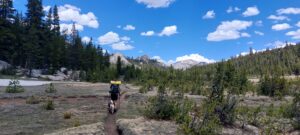 Dann heißt es für mich nach einer Woche Pause wieder in den Wandermodus zu kommen. Es geht gleich steil in Serpentinen zum Kearsage Pass hoch. Ich merke schnell die Höhe, ich muss auf über 3500m steigen und habe mich in letzter Zeit unter 1000m aufgehalten. Ich muss ganz schön schnaufen. Dirk nimmt mir meinen Teil vom Essen ab, so dass ich nur noch Pitas Futter tragen muss. Pita bekommt auch noch etwas Schonung und muss nur ihren Rucksack mit etwas Essen tragen. Die hohen Berge um mich herum sind beeindruckend. Und die klare, kühle Bergluft ist so gut nach 7 Wochen Wüstenluft. Ich geniße jeden tiefen Atemzug. Zudem kommen zwei Geräusche hinzu, die uns die nächsten Wochen durch die Sierra ständig begleiten werden: das Rauschen von Wasser, das werden wir jetzt Tag und Nacht immer hören und das Knirschen von Schnee unter unseren Schuhen.