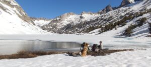 Am dritten Tag haben wir den schwierigsten Pass, den Mather Pass mit 3688m vor uns. Wir sind am Vortag bis fast unterhalb des Passes gelaufen, hatten aber Glück, dass wir unter einem Baum ein schneefreies Fleckchen für unser Zelt gefunden haben. Wir stapfen in der früh noch eine Stunde bis zum Fuss des Passes. Wir lassen Pita immer vor den Aufstiegen kurz frei laufen, damit sie sich austoben kann und dann ruhiger hinter Dirk herläuft. Wir ziehen ihr die Booties aus. Sie rennt wie verrückt durch den Schnee, genießt die Freiheit. Würde sie jetzt die Booties verlieren, würden wir lange danach suchen und es wäre fraglich, ob wir sie wieder finden würden. Zudem braucht sie im vereisten/harschem Aufstieg ihre Krallen. Rutscht sie ab, würde es schwer für Dirk werden, sich und sie zu halten. Natürlich rennt Pita auch über die Granitfelsen, die aus dem Schnee herausragen und steckt in jede Spalte ihre Nase, um zu schauen, ob die Murmeltiere oder Erdhörnchen schon aus ihrem Winterschlaf erwacht sind. Von jedem Freigang kommt unser Wildfang mit blutigen Pfoten wieder, der Granit ist sehr scharfkantig.