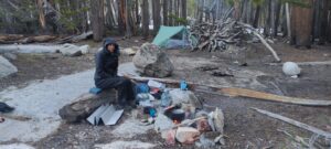 Wir steigen vom Kearsage Pass auf der anderen Seite wieder runter und befinden uns im Kings Canyon National Park. Meine Schuhe und Socken sind mittlerweile durch den Schnee und die kleinen Bäche durchnässt. Dirk meint nur, dass das jetzt so bleibt, bis wir das nächste Mal einen Pausentag machen. Wir schaffen es leider nicht bis zum PCT zurück, nach 13 Kilometern bin ich ziemlich platt, habe durch die Höhe leicht Kopfschmerzen. Zudem zieht eine schlecht Wetterfront auf. Dirk sucht schnell ein halbwegs mögliches Plätzchen für unser Zelt. Im Vorzelt haben wir auf der einen Seite einen dicken Felsen, sowie auf Dirks Schlafseite einen größeren Stein unterm Zelt und Mal wieder steht es völlig krum und schief. Egal, schnell ins Zelt, alles zumachen und schon geht der Graupelschauer los. Dirk legt sich um den Stein herum, Pita findet ihn super und nutzt ihn als Kopfkissen. Ich bin so erschöpft, dass ich am frühen Nachmittag schon sofort einschlafe.