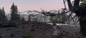 Am dritten Tag haben wir den schwierigsten Pass, den Mather Pass mit 3688m vor uns. Wir sind am Vortag bis fast unterhalb des Passes gelaufen, hatten aber Glück, dass wir unter einem Baum ein schneefreies Fleckchen für unser Zelt gefunden haben. Wir stapfen in der früh noch eine Stunde bis zum Fuss des Passes. Wir lassen Pita immer vor den Aufstiegen kurz frei laufen, damit sie sich austoben kann und dann ruhiger hinter Dirk herläuft. Wir ziehen ihr die Booties aus. Sie rennt wie verrückt durch den Schnee, genießt die Freiheit. Würde sie jetzt die Booties verlieren, würden wir lange danach suchen und es wäre fraglich, ob wir sie wieder finden würden. Zudem braucht sie im vereisten/harschem Aufstieg ihre Krallen. Rutscht sie ab, würde es schwer für Dirk werden, sich und sie zu halten. Natürlich rennt Pita auch über die Granitfelsen, die aus dem Schnee herausragen und steckt in jede Spalte ihre Nase, um zu schauen, ob die Murmeltiere oder Erdhörnchen schon aus ihrem Winterschlaf erwacht sind. Von jedem Freigang kommt unser Wildfang mit blutigen Pfoten wieder, der Granit ist sehr scharfkantig.