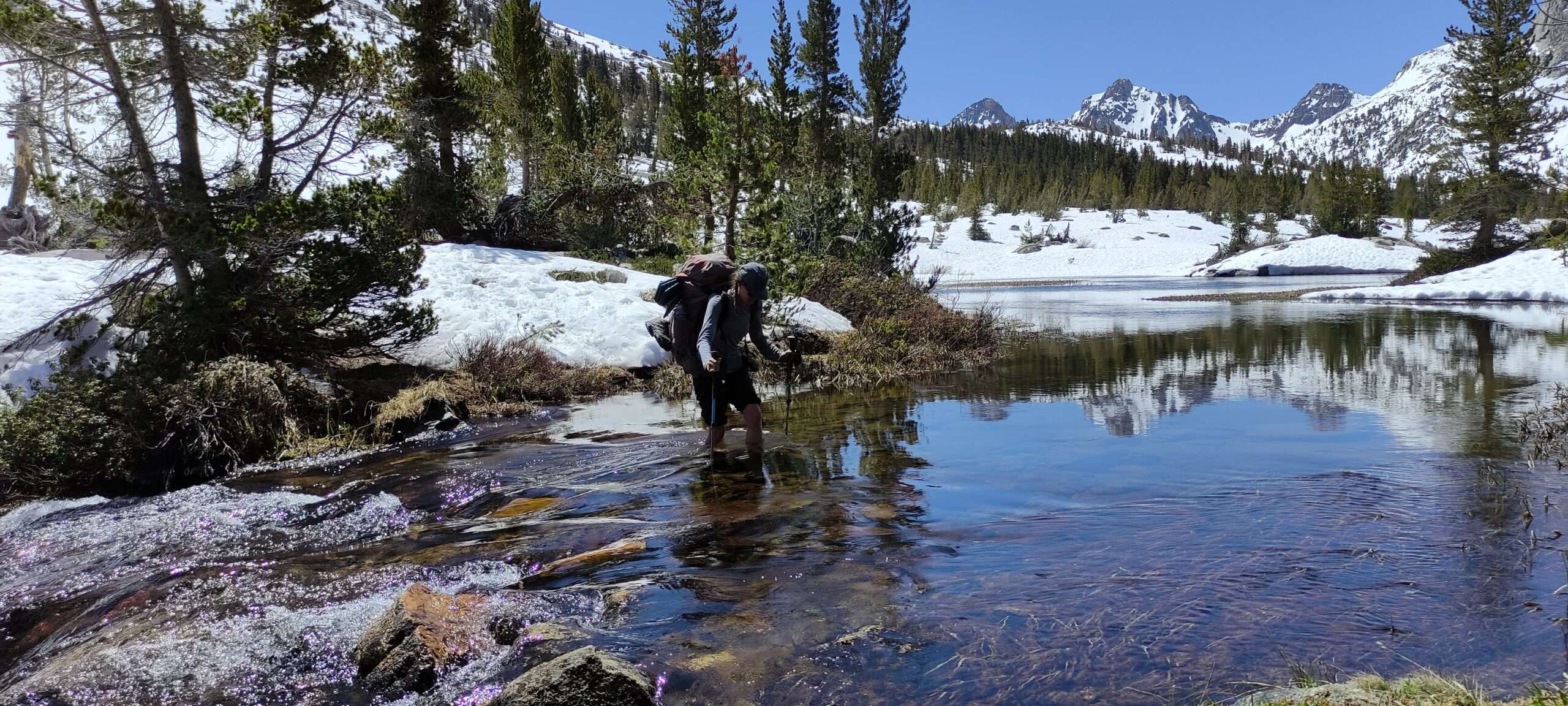 Nach dem Piute Pass wandern wir wieder runter in das Kings Canyon Tal und stoßen wieder auf den PCT. Wir wandern durch schneefreiere Stücke, dafür werden die Bachdurchquerungen mehr. Zeit, um die Socken auszuwringen oder das Wasser aus den Schuhen zu drücken haben wir nicht, dafür müssen wir zu oft durch Bäche. Wenn es zu sehr in meinen Schuhen schwabt, lasse ich kurz das Wasser aus meinen Schuhen laufen.