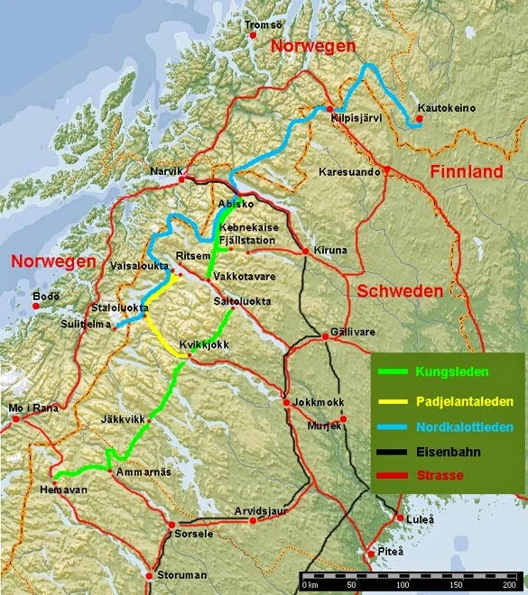 Gesamtlänge: ca. 800 km durch Norwegen (380 km), Schweden (350 km) und Finnland (70 km), startend in Kautokeino (N) und endend wahlweise in Sulitjelma (N) oder Kvikkjokk (S)